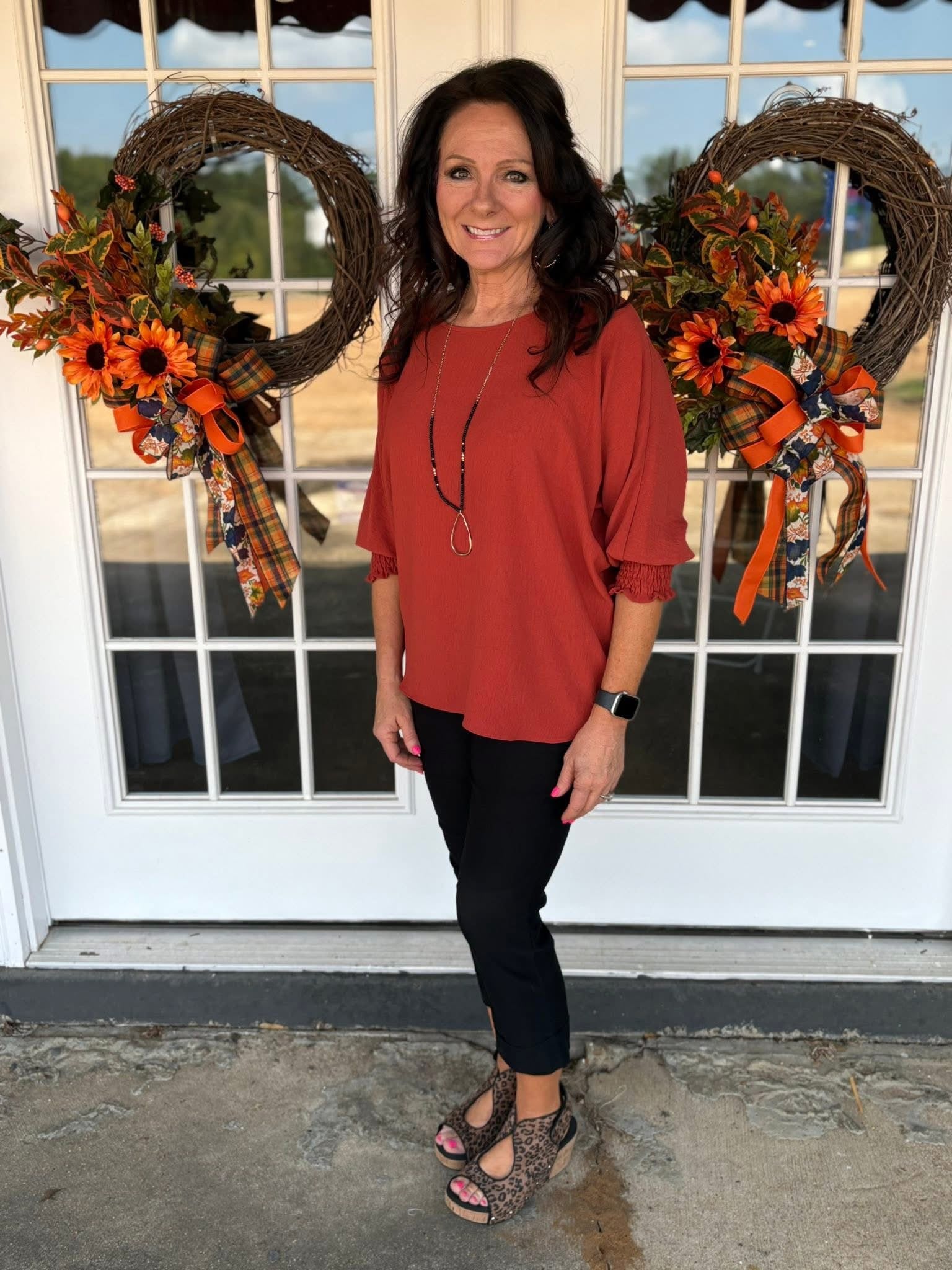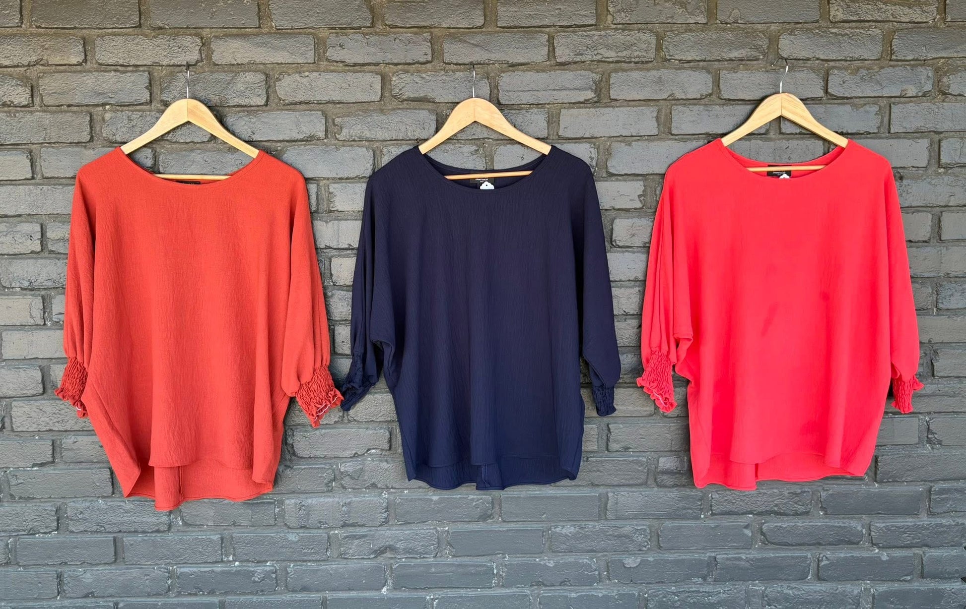 Just in! Our popular “Atlanta” top by LTX is back in stock in three fabulous fall colors! Bright coral, true navy, and cinnamon! Lightweight, easy care airflow fabric! Available in small-3X, slightly oversized fit. Small shown here. Medium measures 27” shoulder to hem. XL measures 29”.