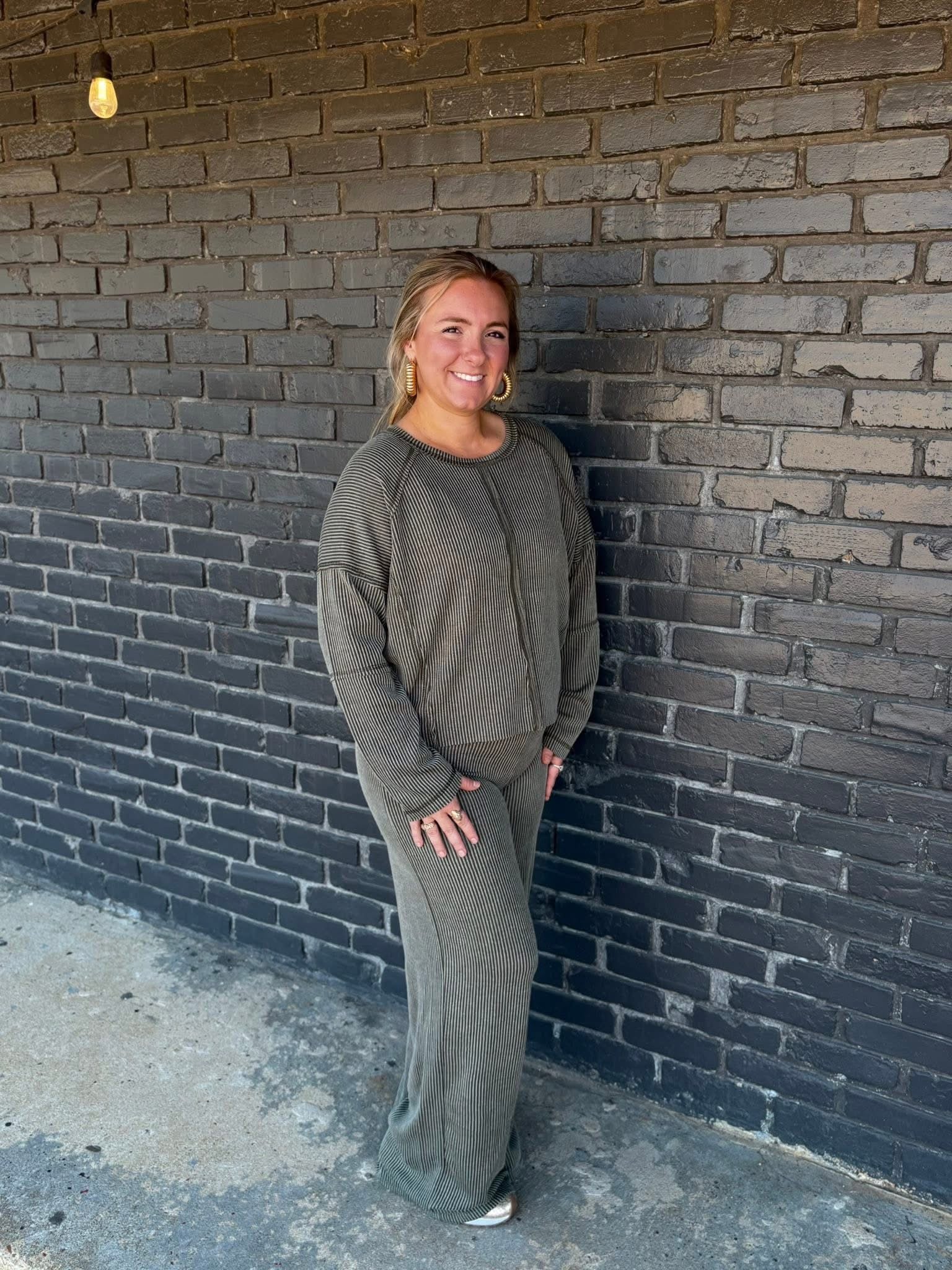 You can’t beat a cute, comfortable 2pc set for everyday wear! This beautiful olive set by Eighty-Five will certainly be one of your fall favorites! Soft, lightweight ribbed knit. Cute raw edge accents. Long sleeve top has a boxy fit. Elastic waist, full leg pants. Small-XL. Medium shown here. Medium top measures 22” shoulder to hem. Pant measures 41” waist to hem.