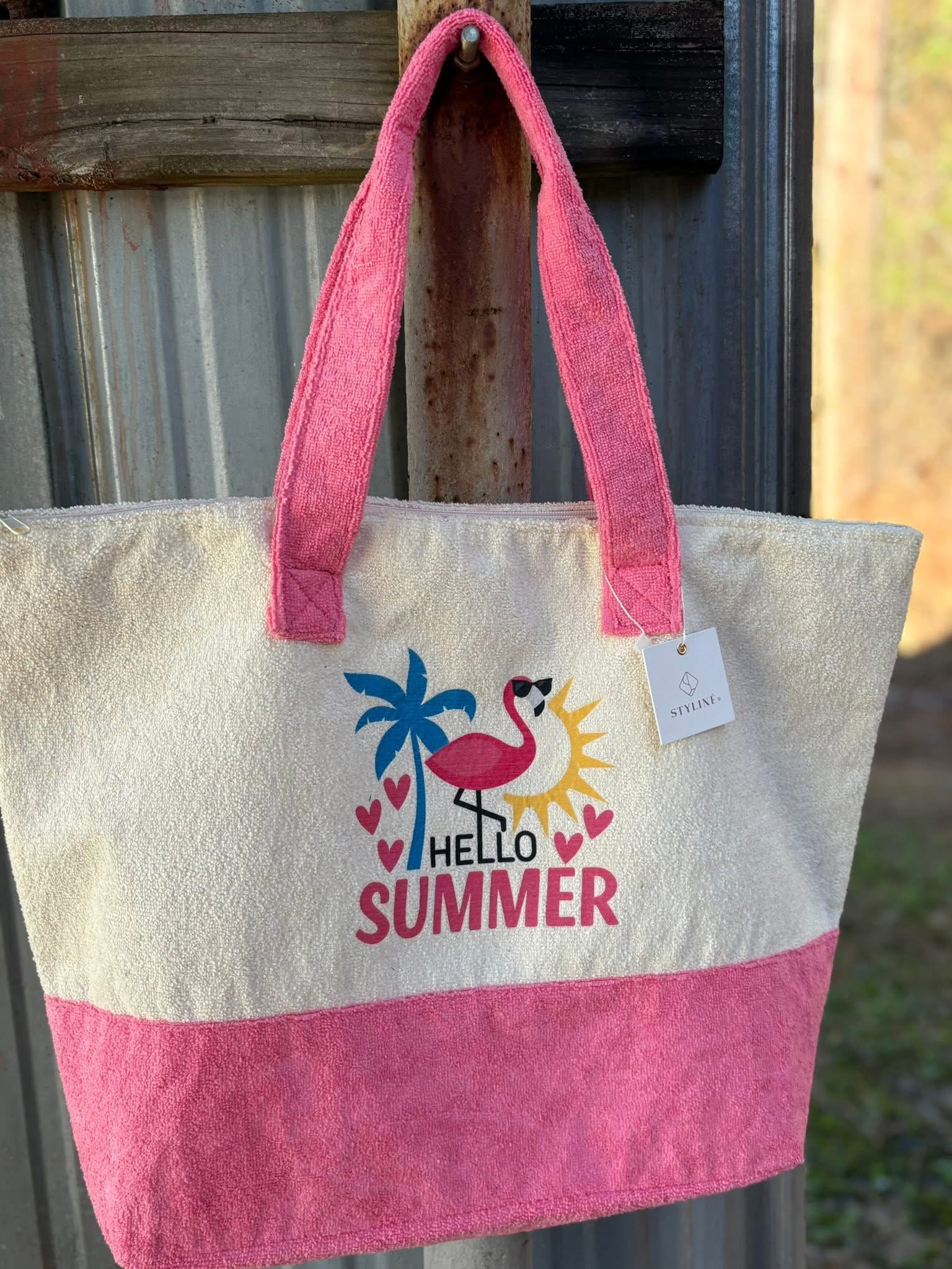 Planning that beach trip? Looking for a great graduation gift? Our super cute, super fun terry cloth beach bags are a perfect idea! Nice inner lining with pockets. Top zipper closure. Double handles. Measures 21”x14”. Machine washable. Available in store now & on our website!
