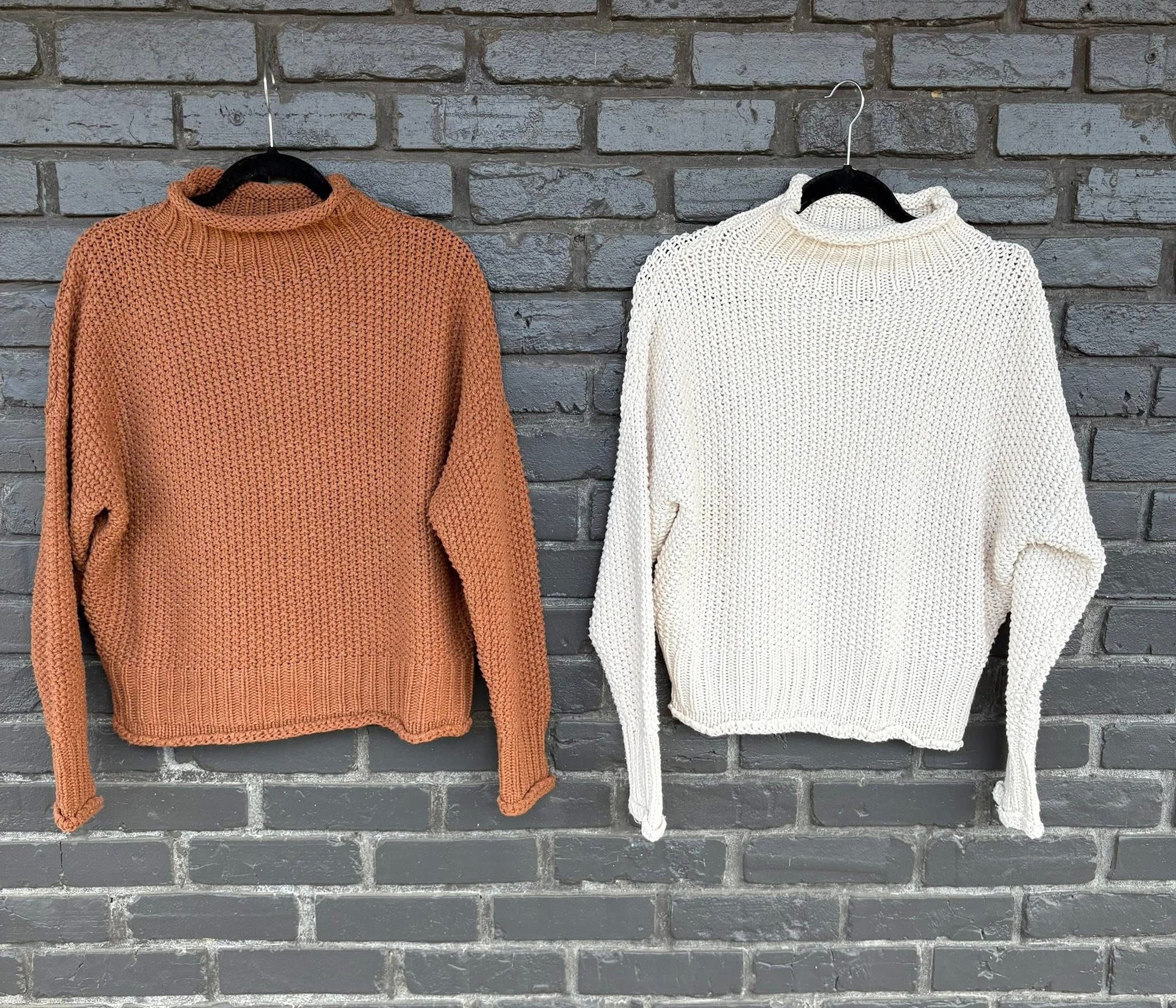 Just in! Our Comfort sweater by She + Sky! Cute boxy fit! Super soft 100% cotton! Available in two perfect fall colors: cinnamon & cream! Sizes small-large. Medium measures 23” shoulder to hem. $48. Love it paired with our new Renour pull on, tapered leg slacks. Sizes 2-16, $68.