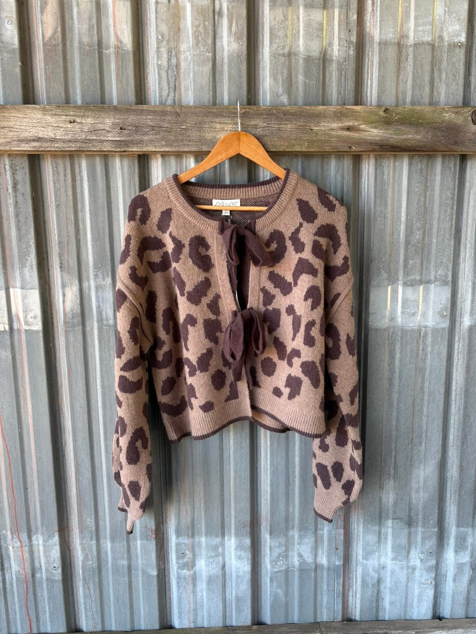 Our new She + Sky Double Tied leopard cardigan in pretty mocha & chocolate! Super soft & comfortable! Measures 27” shoulder to hem. Hits at the top of the hips. Small-large. $48. May be purchased in store now & on our website