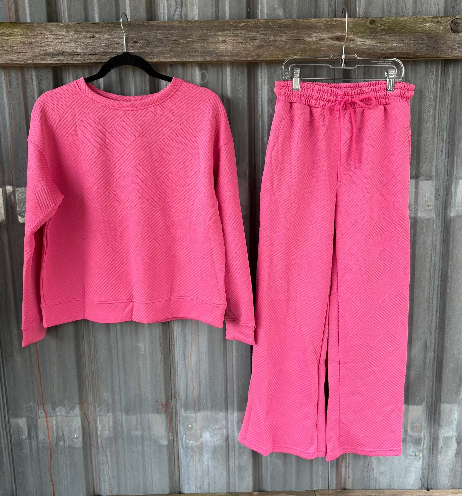 We love cute, comfy little two piece sets & we really love pink, so this cute, comfy little bright pink set is one of our favorites! Lightweight, textured fabric. Boxy fit top. Pull on pants with side pockets. Available in small-XL, loose fit. $52. May be purchased in store and on our website.