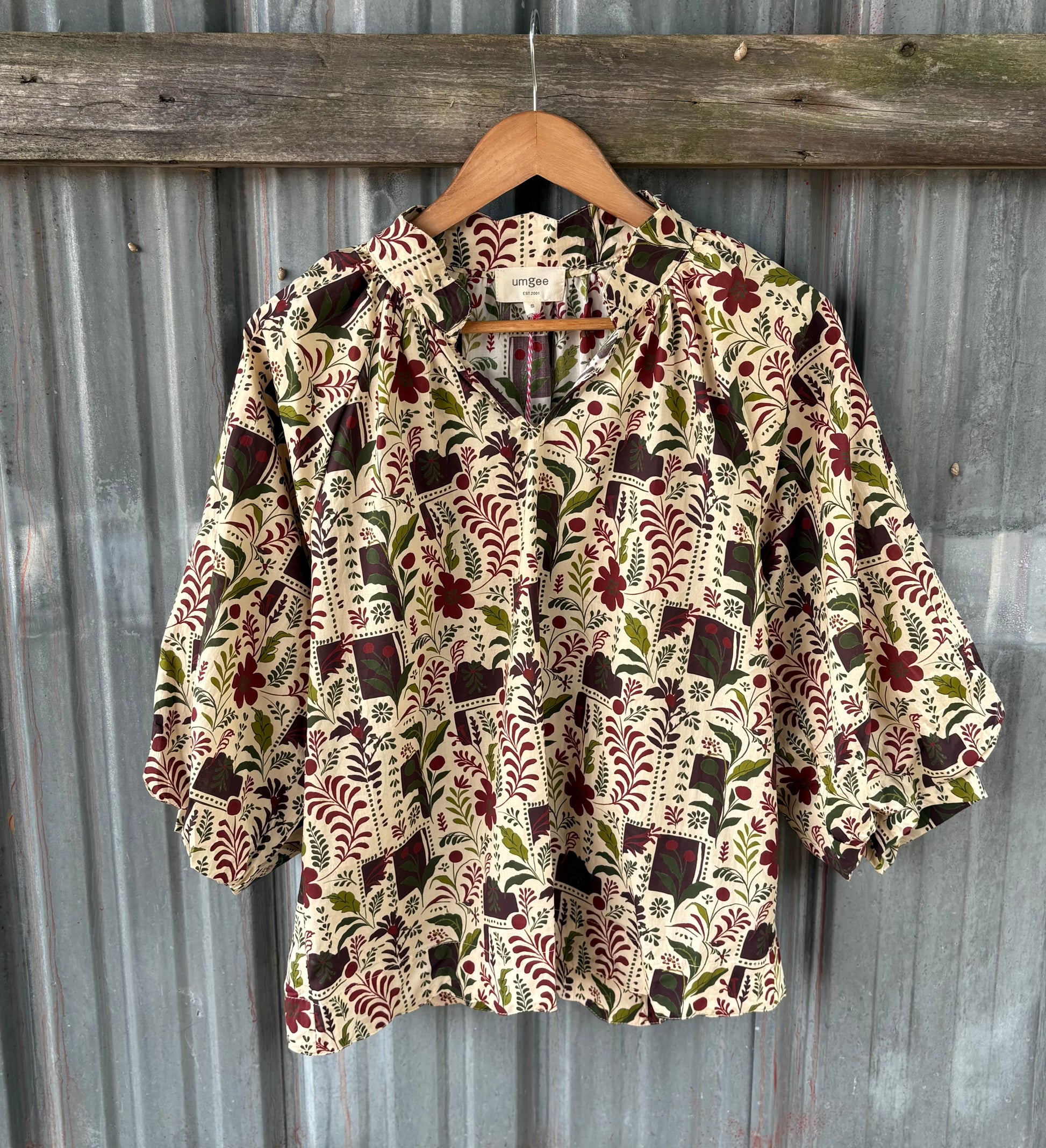 This popular little UmGee top is now available in a lovely print perfect for fall! Pretty shades of green & burgundy pop on a cream background! Love the scalloped neck and hem. Slight v-neck. Full 3/4 sleeves. 100% cotton fabric! Loose fit.