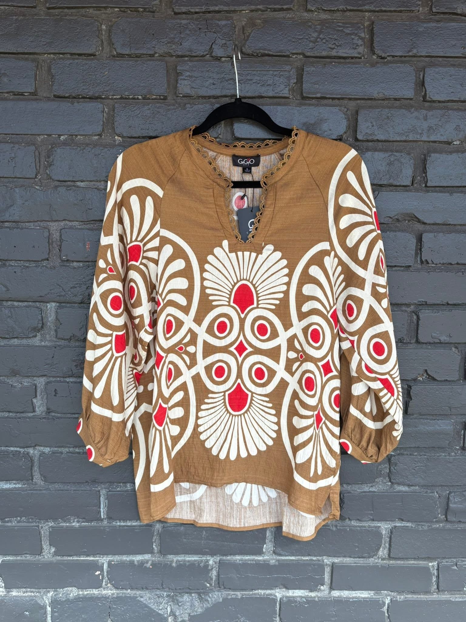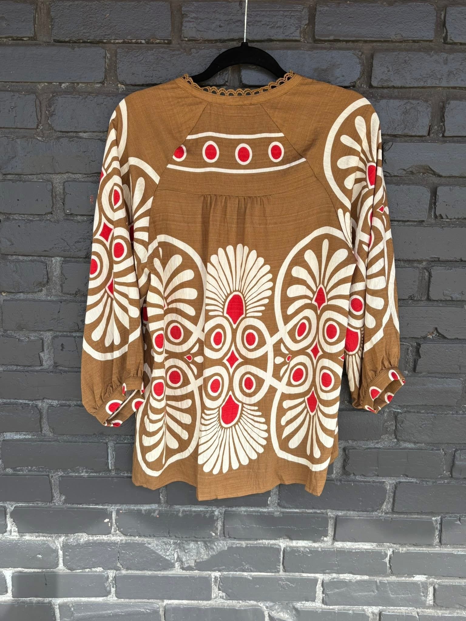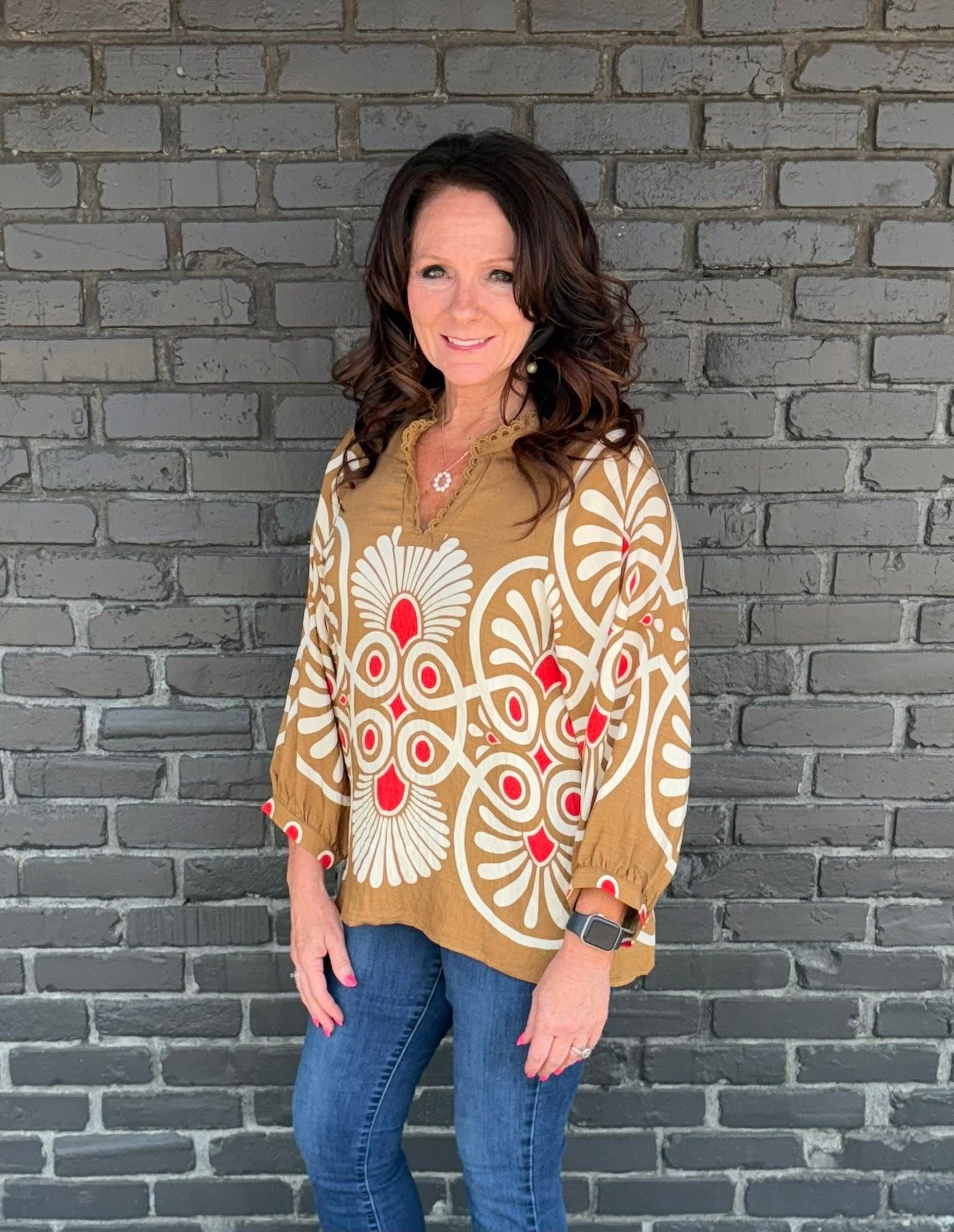 Love how this bold, eye catching pattern in ivory & red pops on the dark gold background! Slight v-neck with matching lace trim! Long sleeves. Hem slit accent! Lightweight, comfortable fabric! Perfect with jeans, but will fabulous with winter white pants! Small-large. Slightly oversized. Small shown here. Medium measures 27” shoulder to hem.