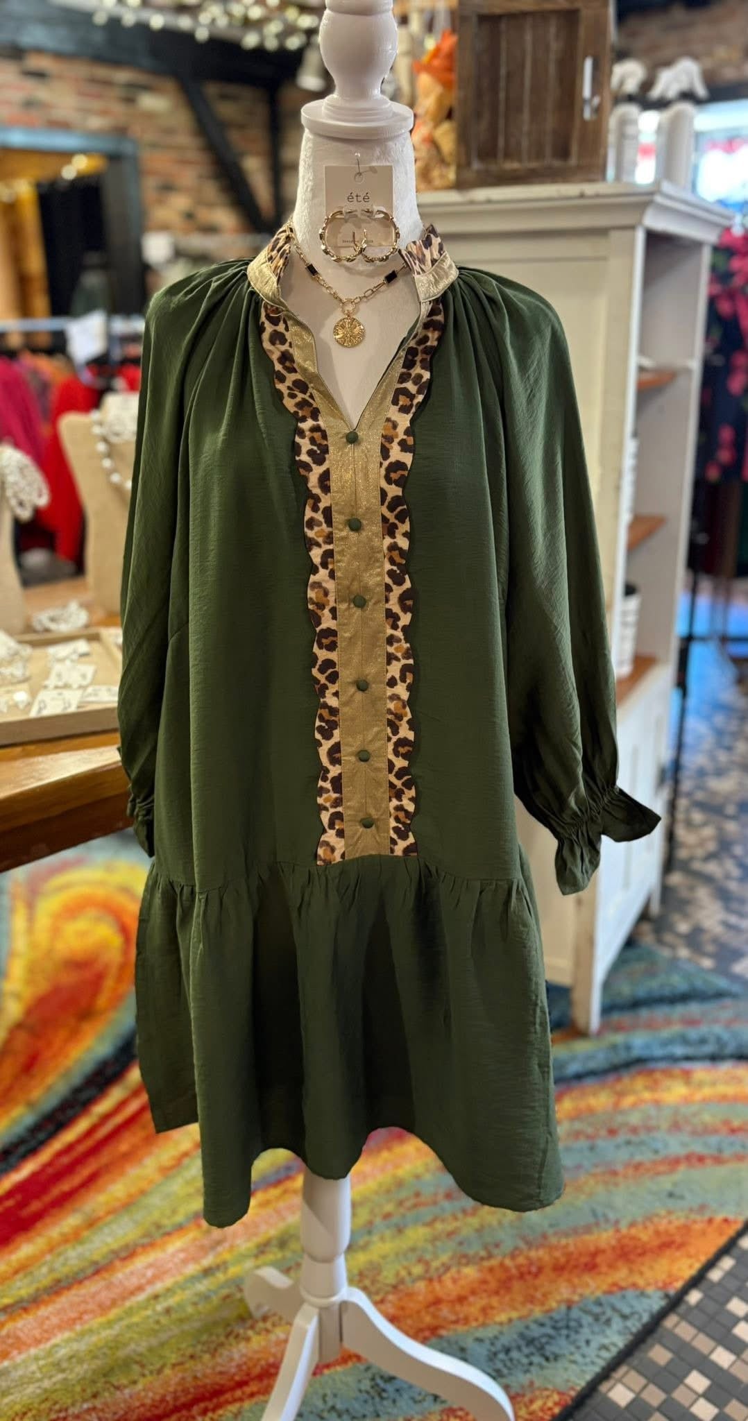 We LOVE this fun new “Let’s Party” dress by Umgee! Beautiful Viscose fabric in a lovely shade of olive green! Metallic gold & leopard trim steals the show! Cute drop waist & wide ruffle hem! Definitely a fall favorite! Small-large. Slightly oversized. Medium measures 35”