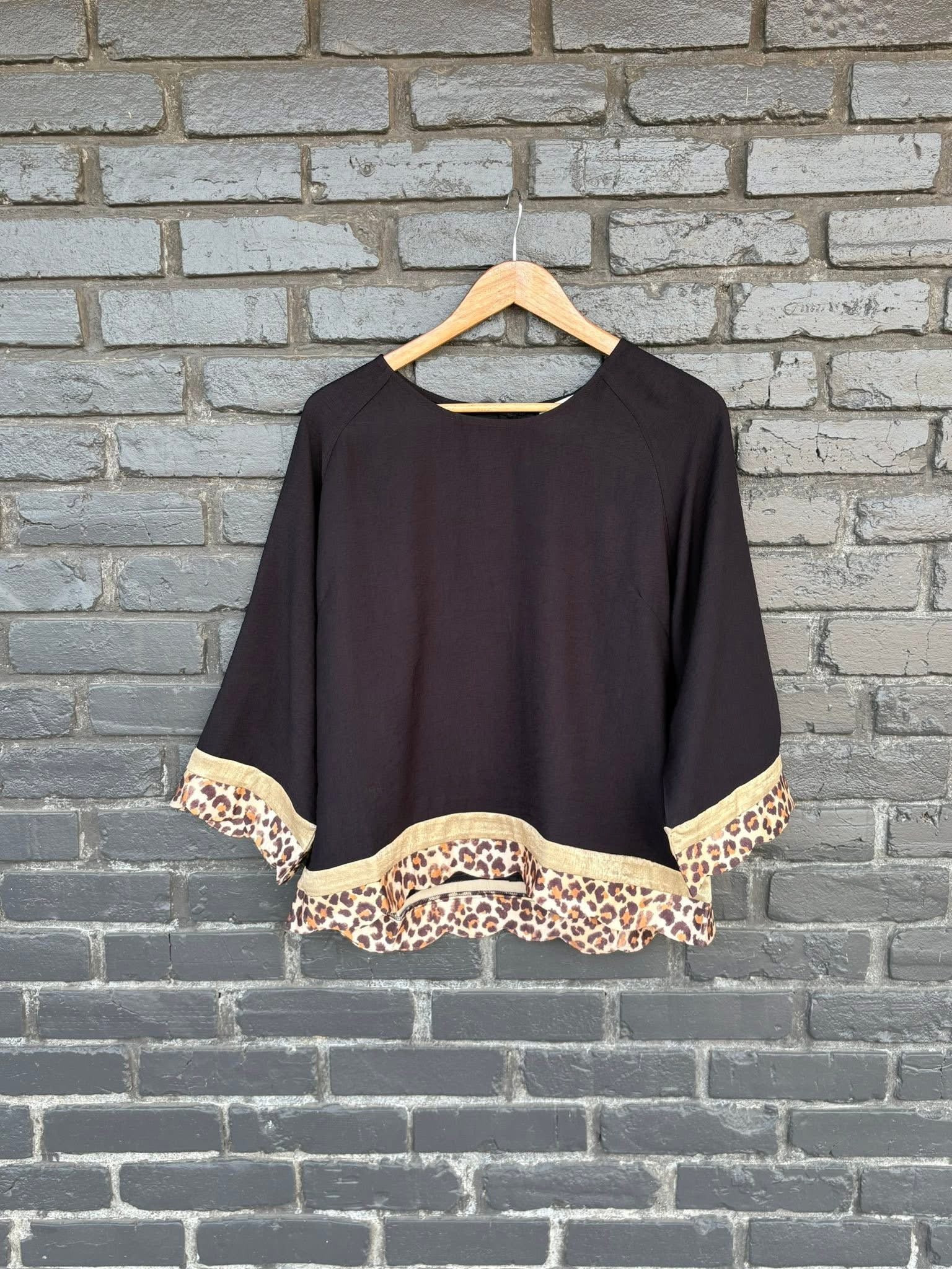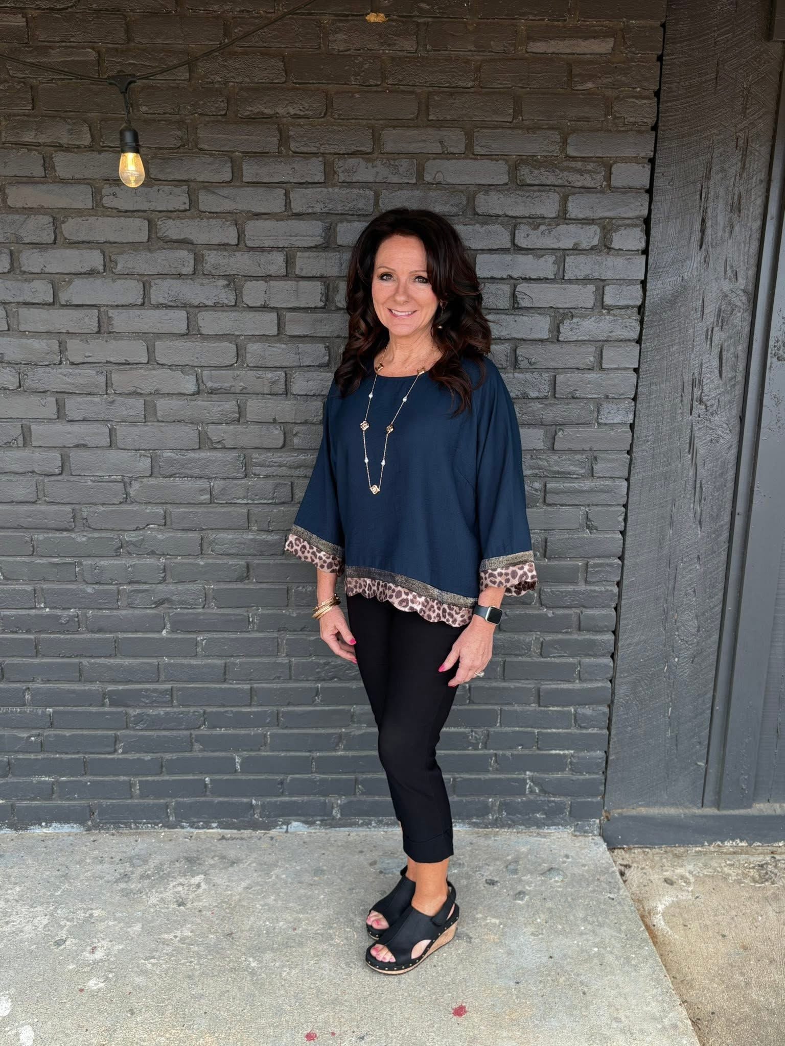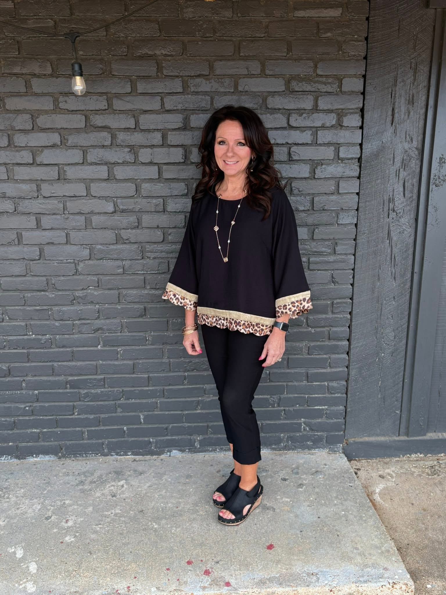 Just in! Our “Little Bit of Leopard” top by Umgee! Cute, simple design! Love the metallic stripe & leopard accents on the scalloped hem & sleeves! Soft Viscose fabric! Available in Jade (medium & large) and black (small-large). Small shown here. Medium measures 24” shoulder to hem. $44.