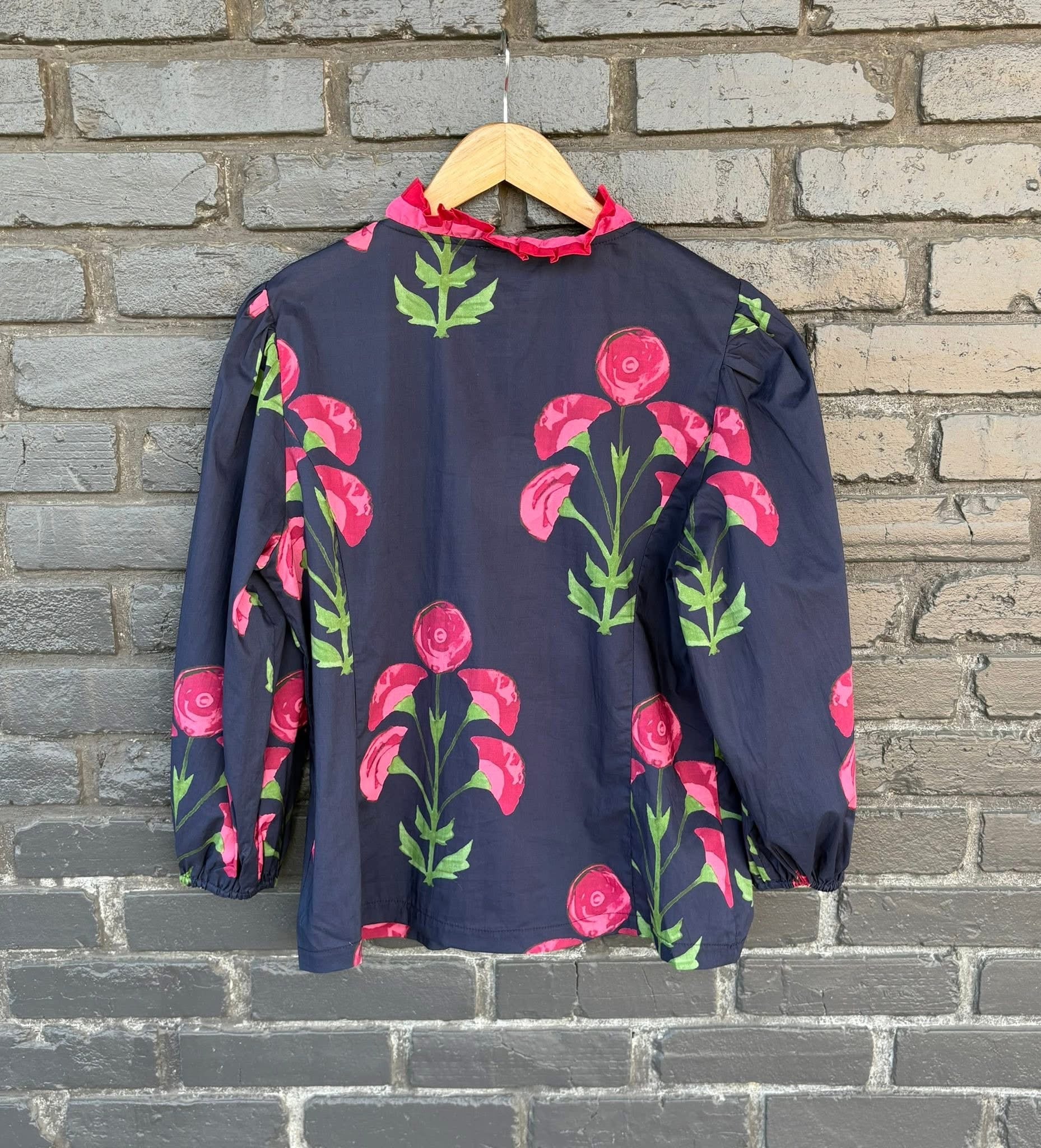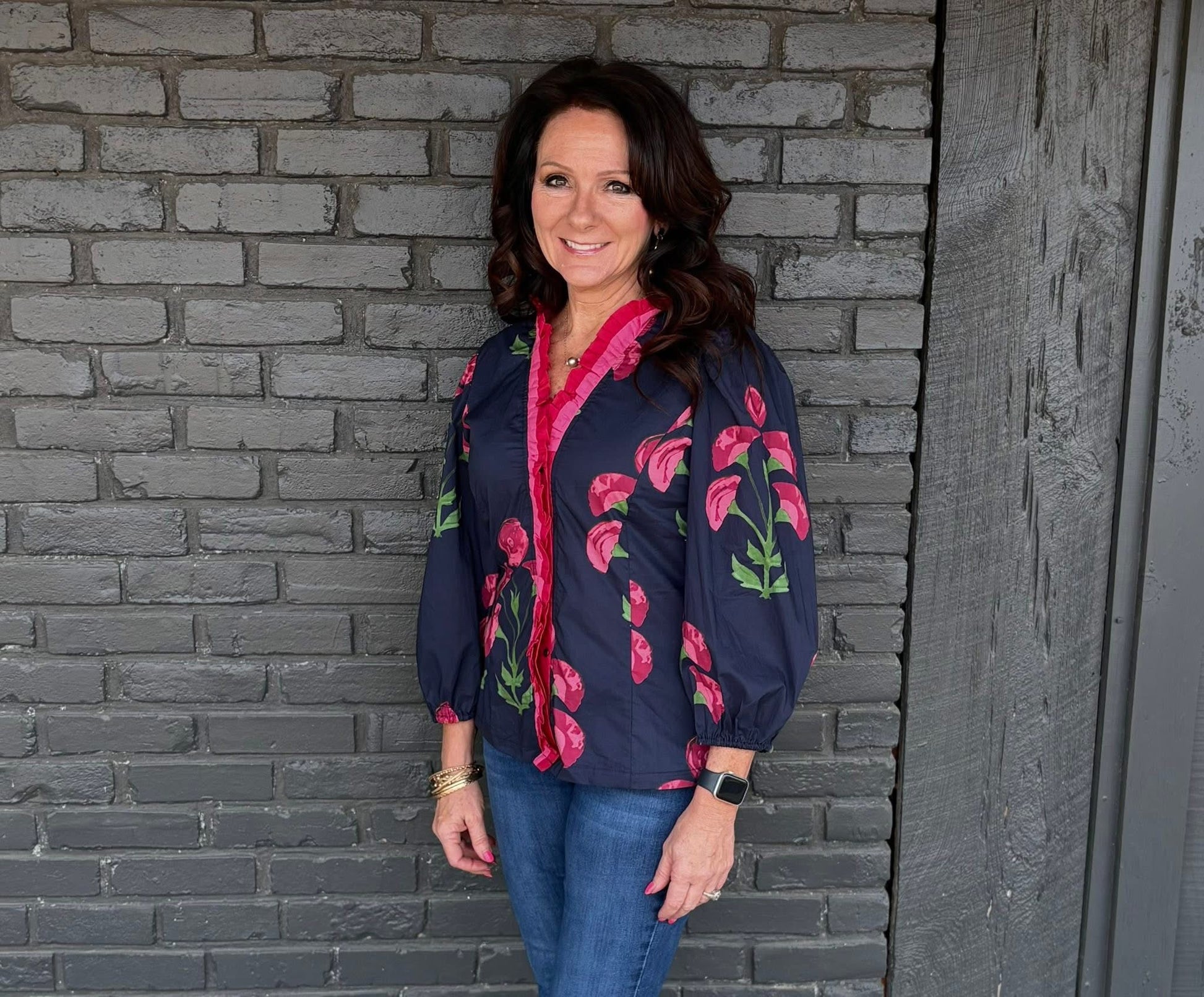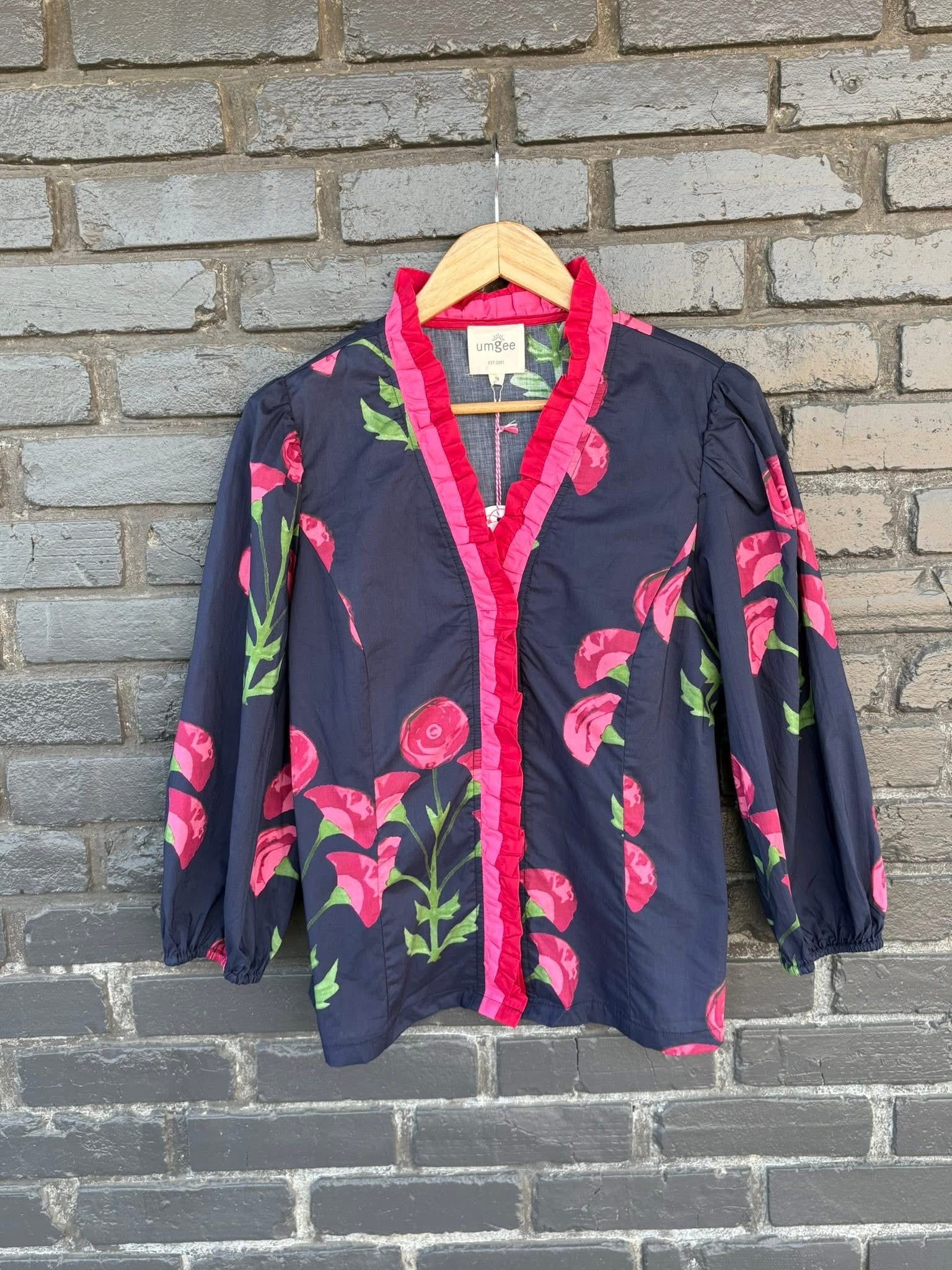 Just in! Our “Making Me Happy” top from Umgee in small-2X truly makes me happy! Bright pink & red flowers & ruffled trim pop against the navy background! Slightly more fitted style! Long sleeves. Comfortable 100% cotton fabric! Medium shown here. Medium measures 24” shoulder to hem. 1X measures 27”. $42.