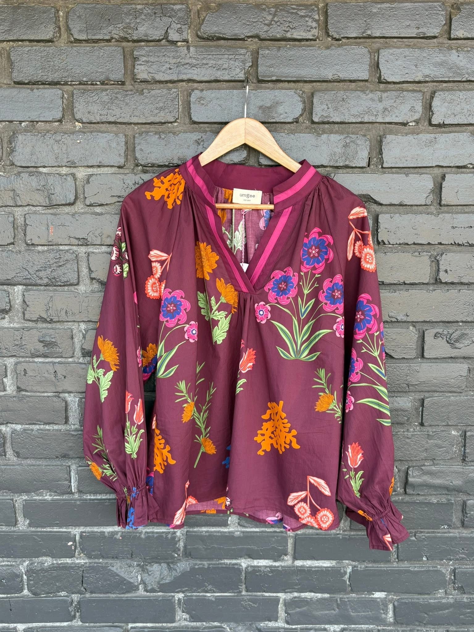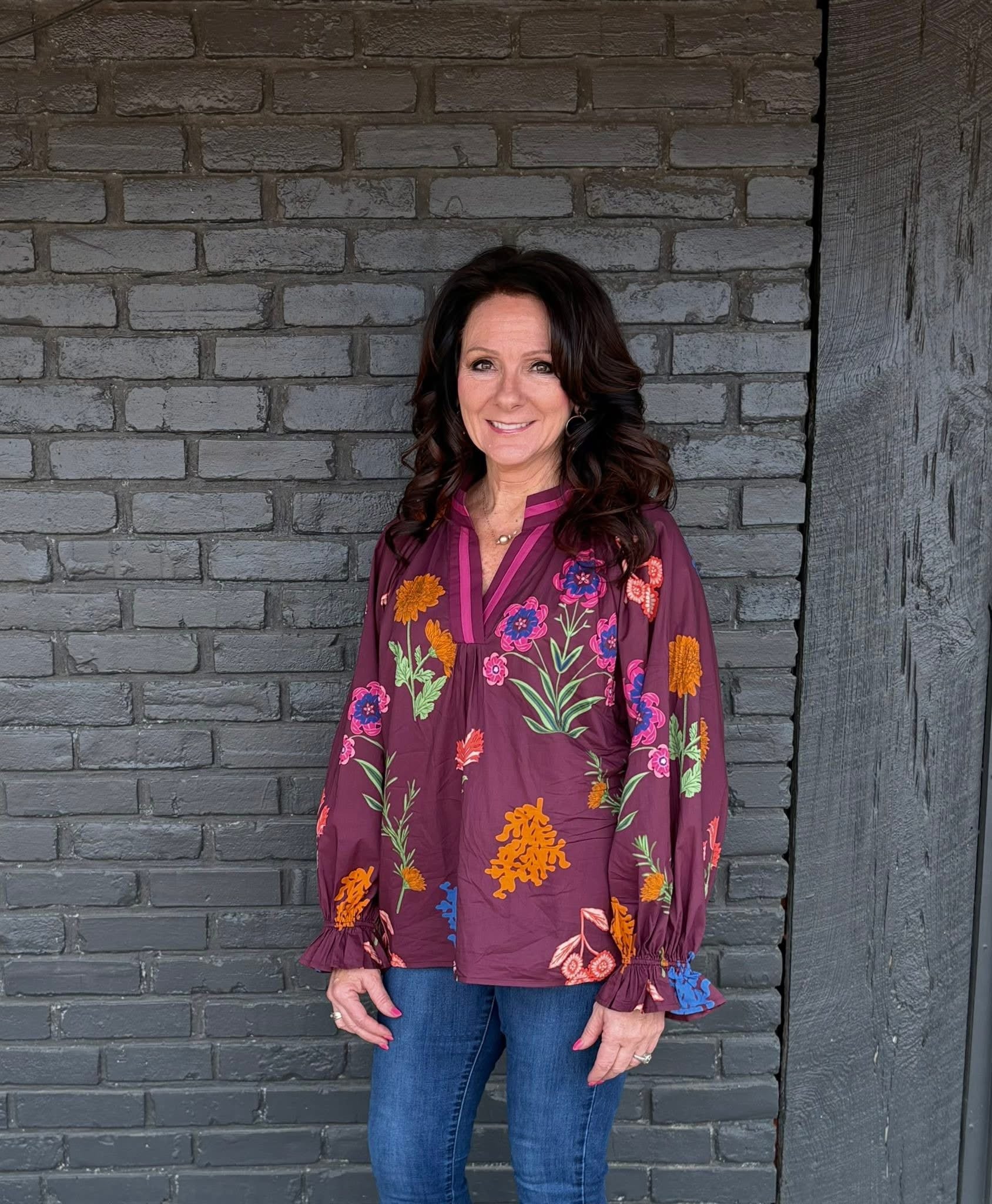 We truly are crazy about our new “Plum Crazy” top by Umgee! Beautiful, bright flowers pop on the deep plum background! Slight v-neck! Long sleeves! Comfortable 100% cotton fabric! Available in small-2X! Small shown here. Medium measures 25” shoulder to hem. 1X measures 28”. $46.