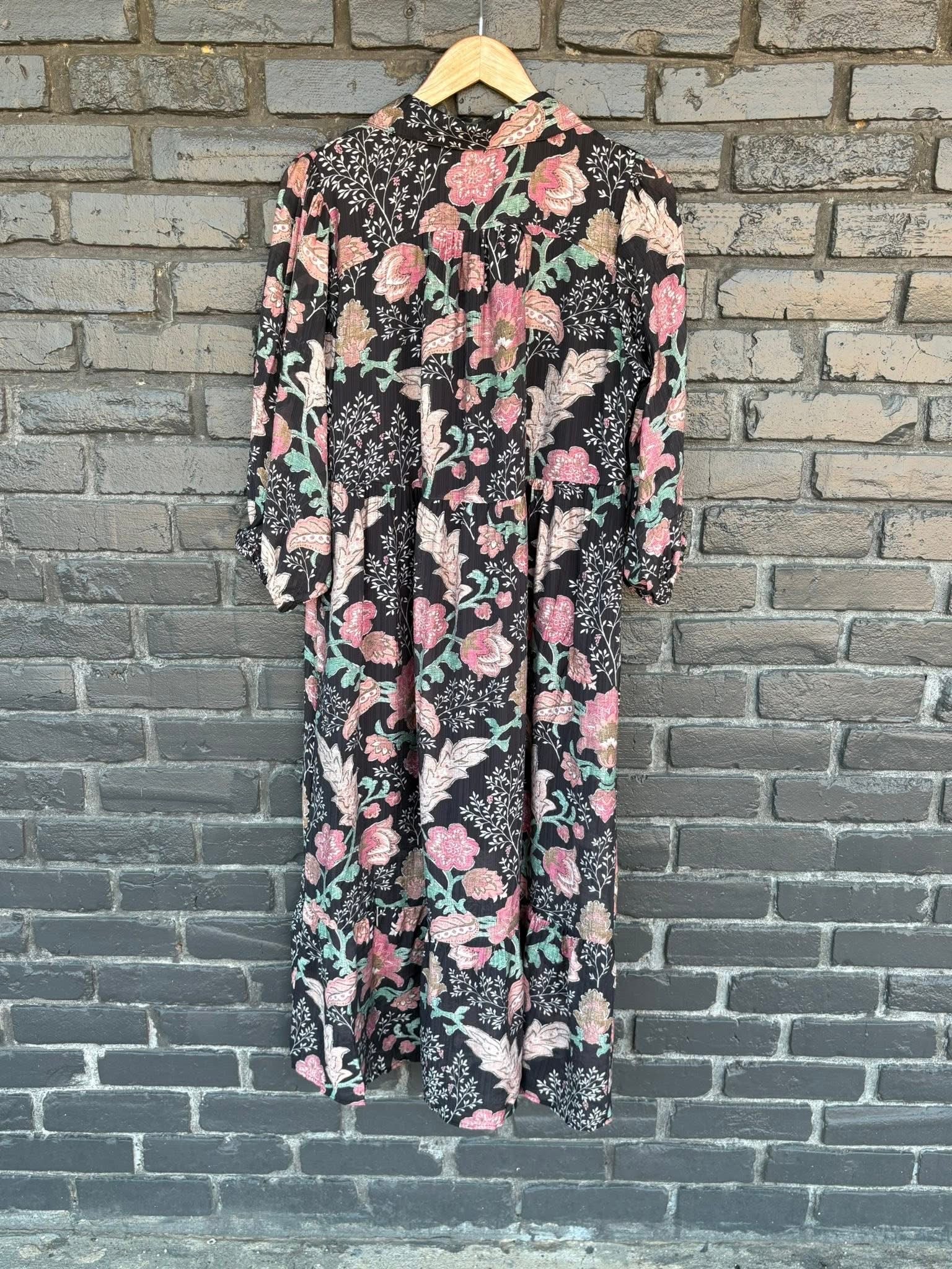 How pretty are the soft shades of pink, green, & ivory flowers on the black background! They absolutely pop! Comfortable, lightweight fabric with a black satin lining. 3/4 length sleeves. Full skirt with a wide ruffled hem. Small shown here. Medium measures 47” shoulder to hem. Perfect paired with our new Corkys Boutique Frisky wedges in black suede! $64.