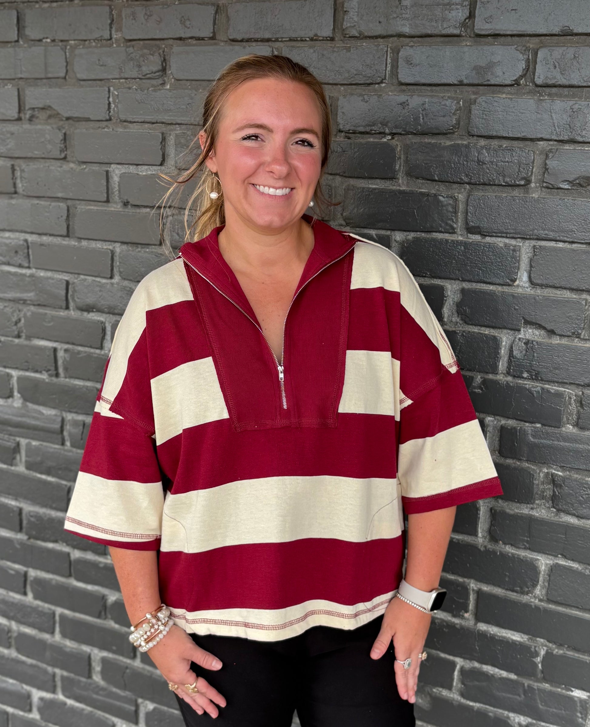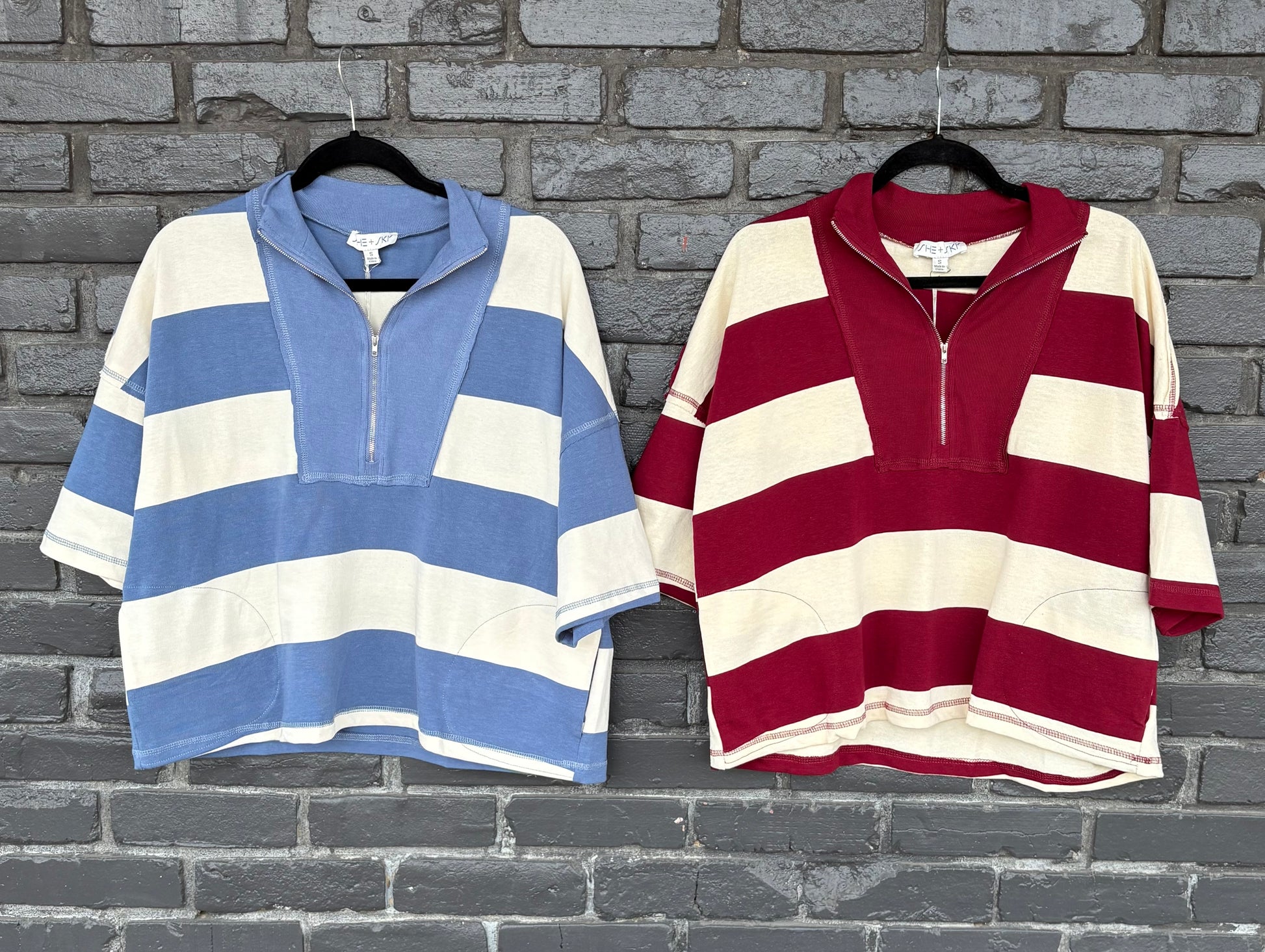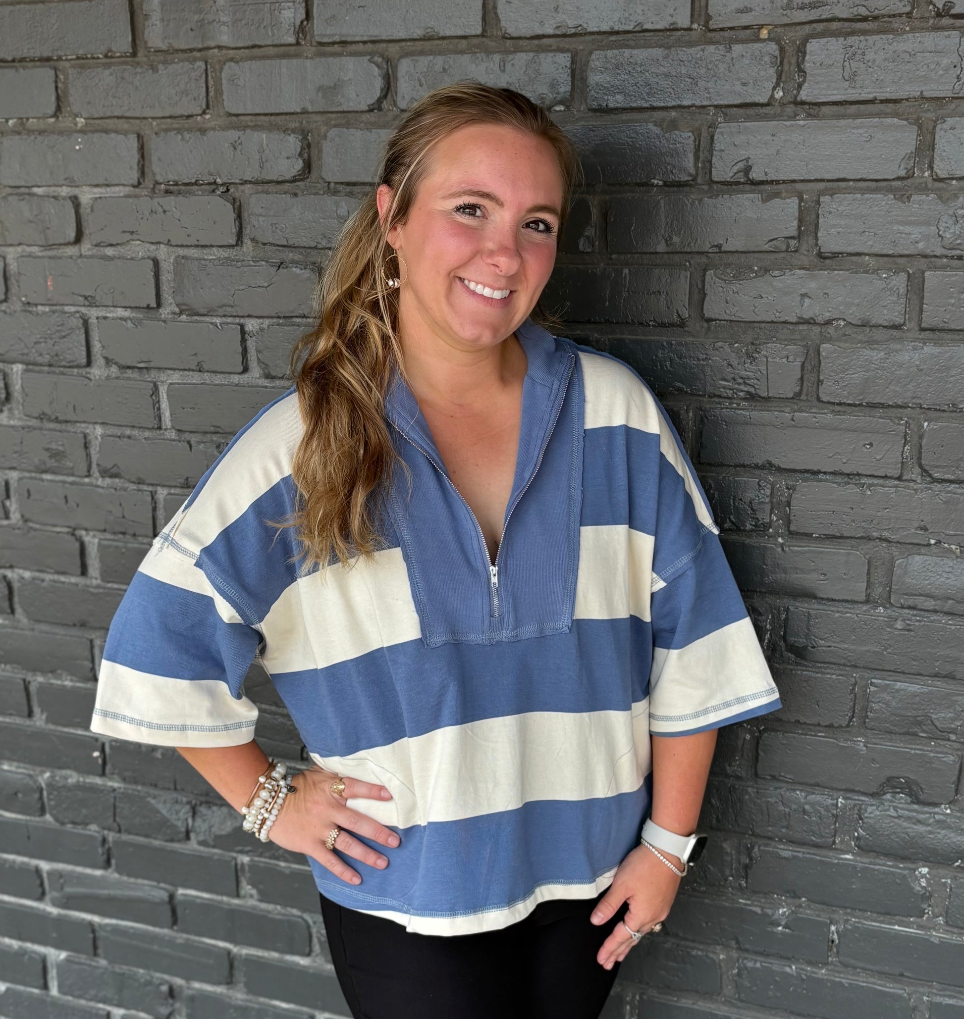 Cute, casual, and oh-so-comfy describes this new “Feelin Sporty” pullover by She + Sky! 100% cotton! 3/4 zip front! Loose, boxy fit! Elbow length sleeves! Fun side pockets! A perfect game day or any day top! Small shown here. Medium measures 23” shoulder to hem.