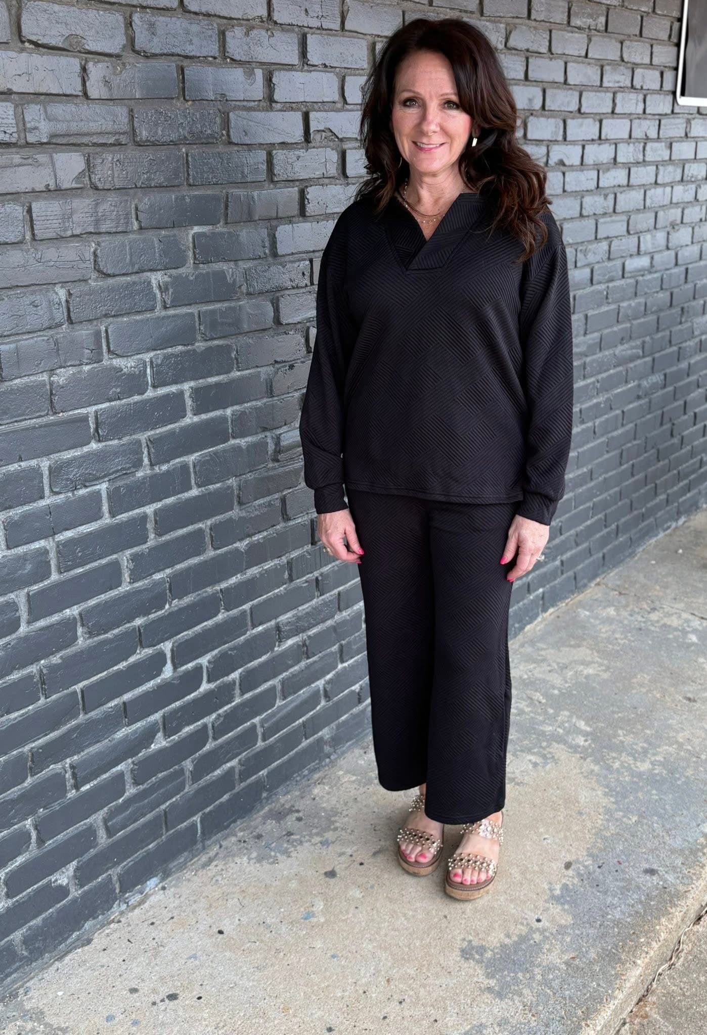 v-neck pullover. Elastic waist pull on ankle pants with pockets. Soft, comfortable, easy care textured fabric! Available in black and gray. Sizes small-XL. Large top measures 25” shoulder to hem. Pants 36” waist to hem.