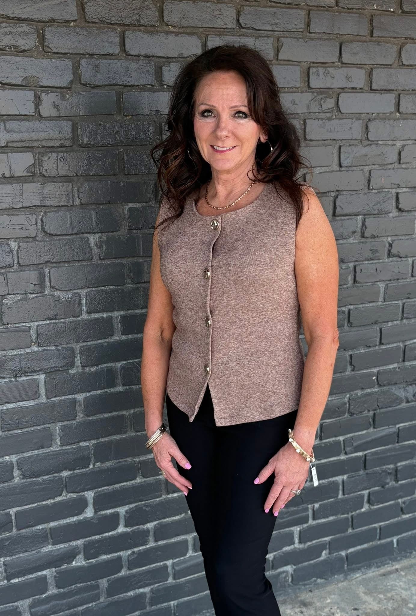 Vests are what’s hot for fall & you’ll love this little heathered mocha vest by She & Sky! Amazingly soft micro ribbed knit fabric! Chic gold front buttons! Perfect dressed up or casual! Small - large. True fit. Medium shown here. $44. Medium measures 22” shoulder to hem.