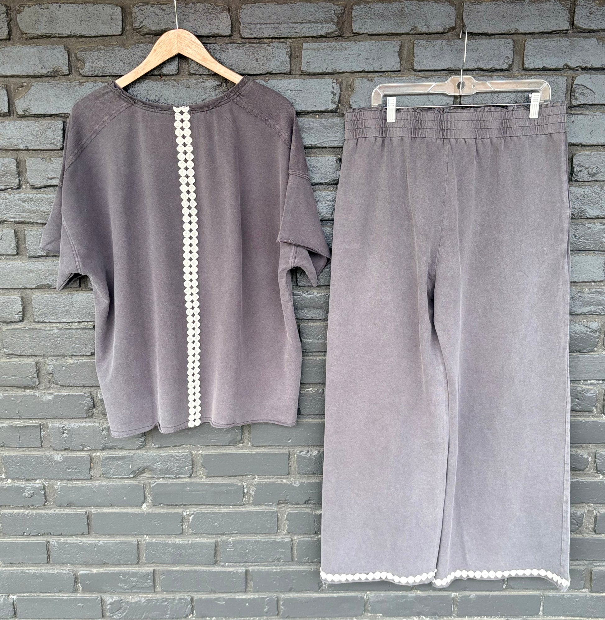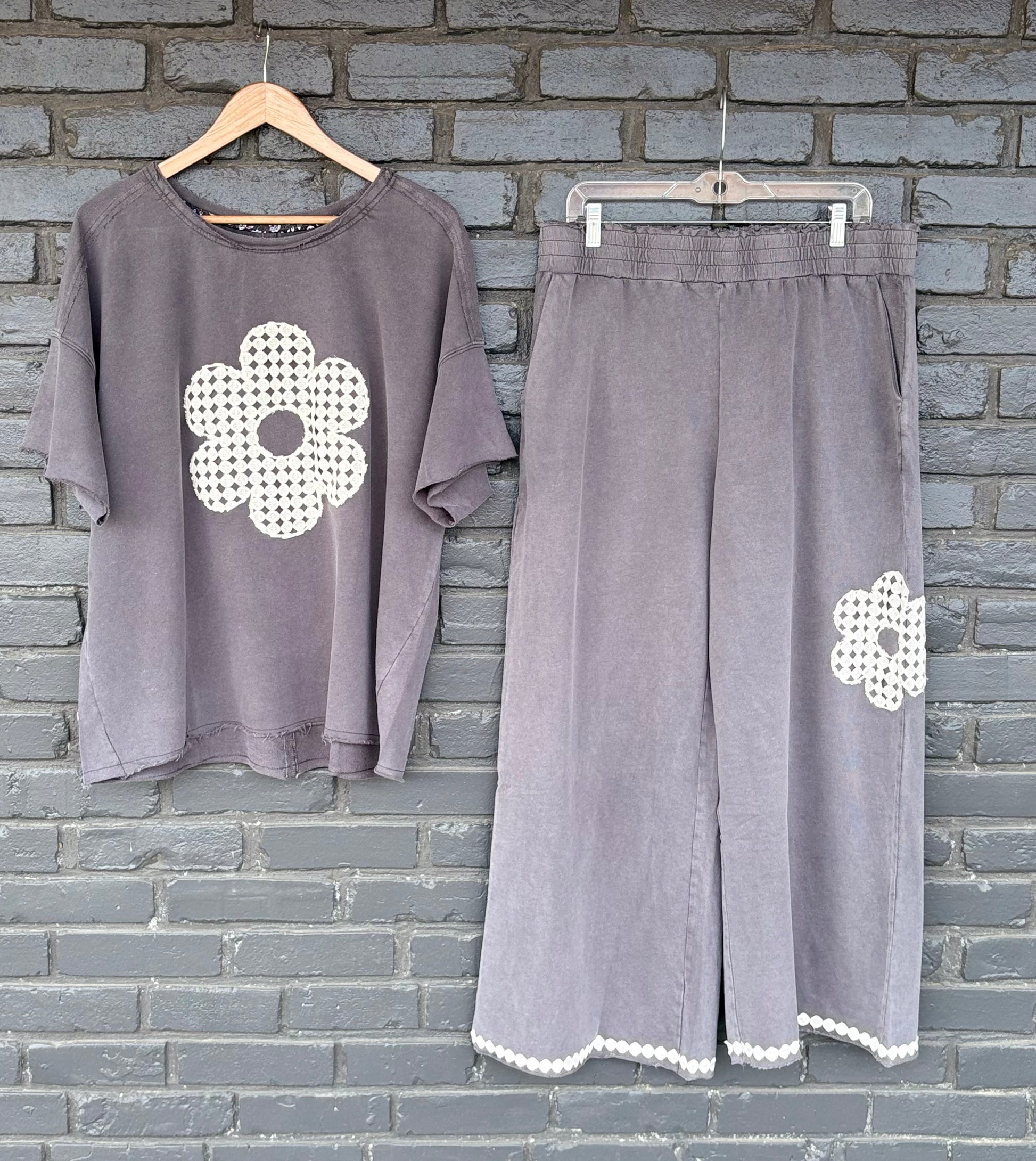 How cute is this set? Soft, comfortable 100% mineral washed French terry cotton! Both pieces have a loose, unstructured fit! Cute, raw rolled edges and hems! Love the vintage lace daisy on the shirt front and pant leg and lace detail on the back and pant hem!