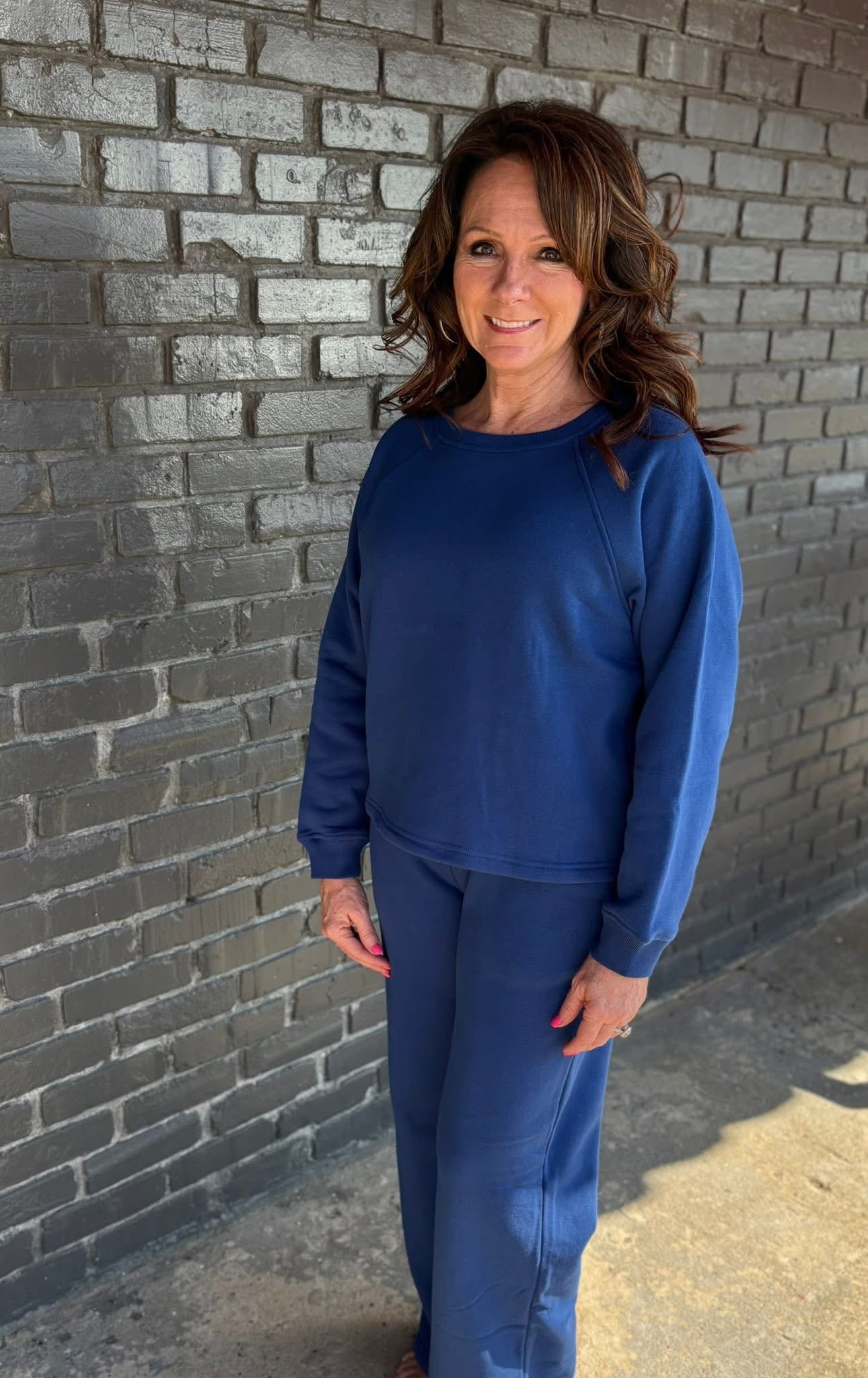 Just in! And, so comfy & cozy! Our new Zenana “Cozy” 2pc set! Softly fleeced inside! Shorter length top hits at the hips for an updated look! Pull on, full leg pants! Available in two great colors: navy & true red! Small-large. $48 set.